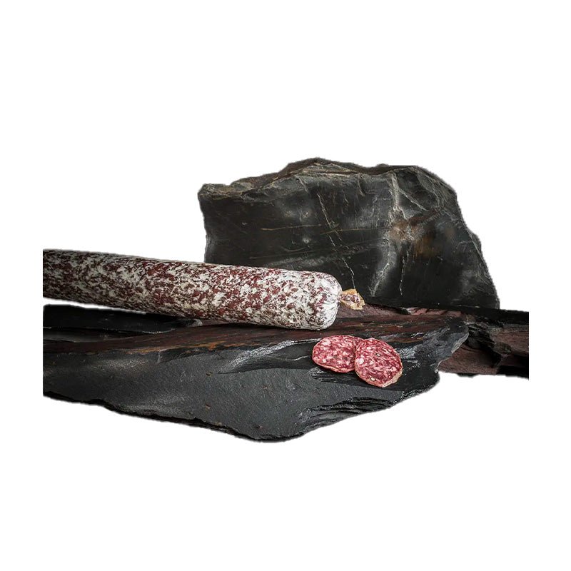 Le Salchichón de Bellota 100% Ibérique en format vela de Maldonado est élaboré avec de la viande de porc 100% ibérique nourri aux glands et affiné lentement pour un arôme élégant, une texture ferme et juteuse et une saveur profonde avec des notes de poivre ; chaque pièce pèse environ 0,300–0,450 kg et mesure 25 cm de long sur 3 cm de diamètre. Il est recommandé de le tempérer et de le couper en fines tranches avant de le déguster, idéal avec du pain candeal ou des regañás et des vins fins ou des vins rouges jeunes.